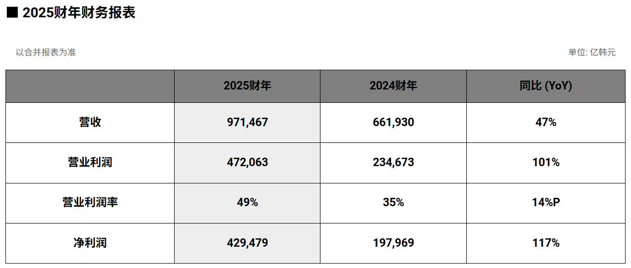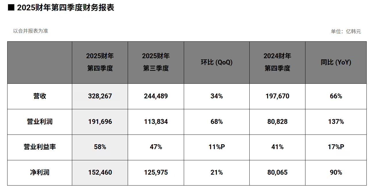 第四季度業績表現尤為亮眼。當季營收32.8267萬億韓元(約合1579.62億元人民幣),環比增長34%;營業利潤19.1696萬億韓元(約合922.44億元人民幣),環比增長68%,營業利潤率高達58%。三項指標均創下單季歷史新高。公司管理層表示,這一突破得益于AI驅動的市場轉型戰略,通過提升技術競爭力、擴大高附加值產品占比,實現了收益與增長的平衡。