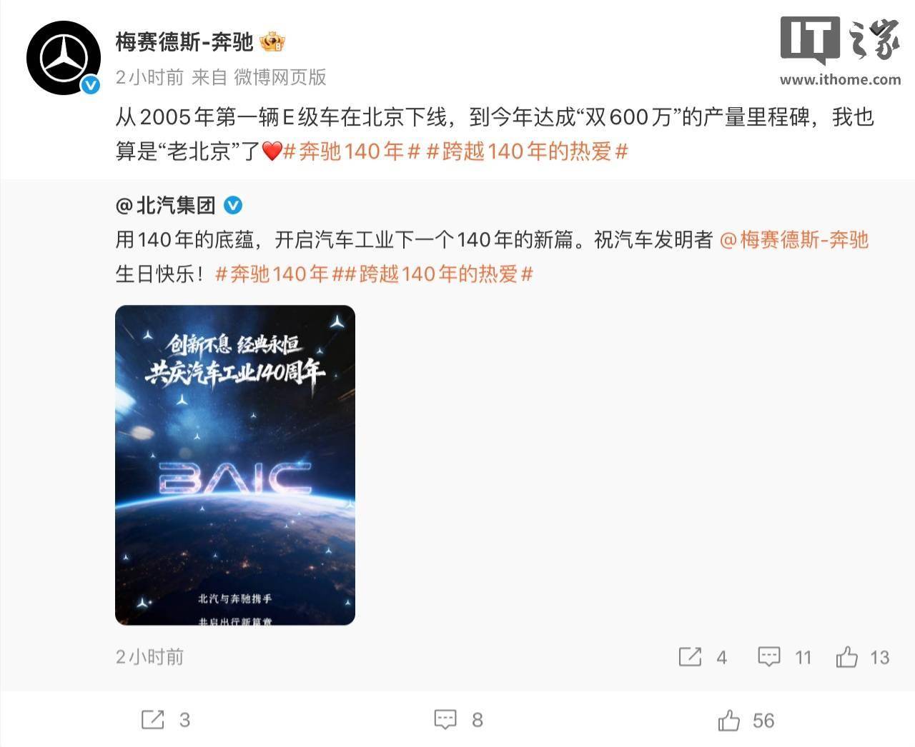 多家中外車企紛紛向梅賽德斯-奔馳送上生日祝福,以不同方式表達對這位行業先驅的敬意。北汽集團在賀詞中提到:“用140年的底蘊,開啟汽車工業下一個140年的新篇。”奔馳則幽默回應,稱自己從2005年第一輛E級車在北京下線,到今年達成“雙600萬”產量里程碑,早已是“老北京”了。
