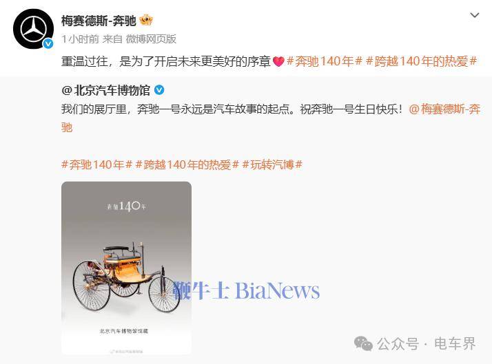 吉利汽車特別強調中國車企的全球地位,以"來自中國汽車全球領跑者的'吉'時祝福"表達祝賀。奔馳方以"借你'吉'言,奔馳路上,吉利相伴"的回應,既體現文化共鳴又彰顯開放胸懷。北京汽車博物館同步曬出展廳中的"奔馳一號"實車照片,為這場行業慶典增添歷史厚重感。