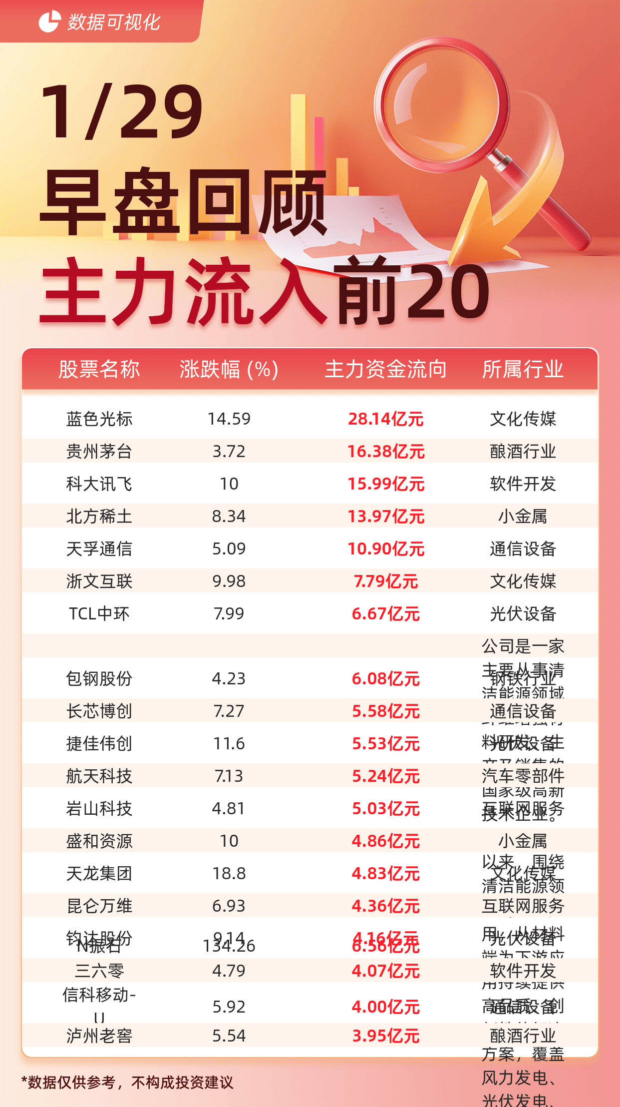 根據交易所最新披露的數據,1月29日午間收盤前,A股市場主力資金呈現顯著分化格局。以藍色光標、貴州茅臺、科大訊飛為代表的20只個股成為資金追逐焦點,其中藍色光標以28.14億元凈流入額位居榜首,較第二名貴州茅臺高出近12億元,形成明顯斷層優勢。