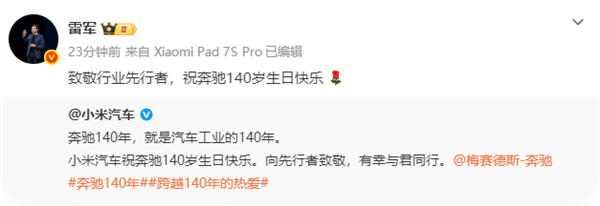 隨后,小米集團創始人雷軍也發聲致敬行業先行者,祝愿奔馳140周歲生日快樂,進一步彰顯了行業內的友好氛圍與對前輩的尊重。