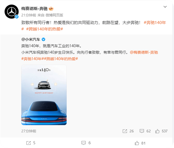 在奔馳迎來140歲生日之際,汽車行業內眾多品牌紛紛送上祝福,共同為這一行業先驅慶賀。小米汽車官方率先發文表示:“奔馳140年,就是汽車工業的140年。小米汽車祝奔馳140歲生日快樂,向先行者致敬,有幸與君同行?!弊掷镄虚g流露出對奔馳的敬意以及攜手共進的愿景。