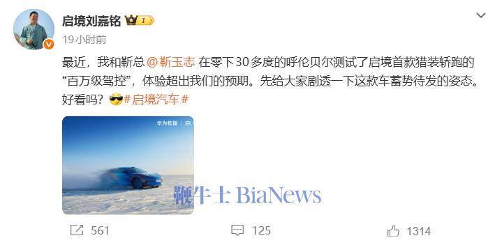 就在宣布新車亮相計劃的前一天,啟境汽車CEO劉嘉銘在社交媒體上透露,他近期與華為智能汽車解決方案BU CEO靳玉志一同前往零下30多度的呼倫貝爾,對這款獵裝轎跑的“百萬級駕控”系統(tǒng)進行了極端環(huán)境測試。劉嘉銘表示,實際體驗遠超預(yù)期,無論是車輛的操控穩(wěn)定性還是智能系統(tǒng)的響應(yīng)速度,都展現(xiàn)出了極高的水準。