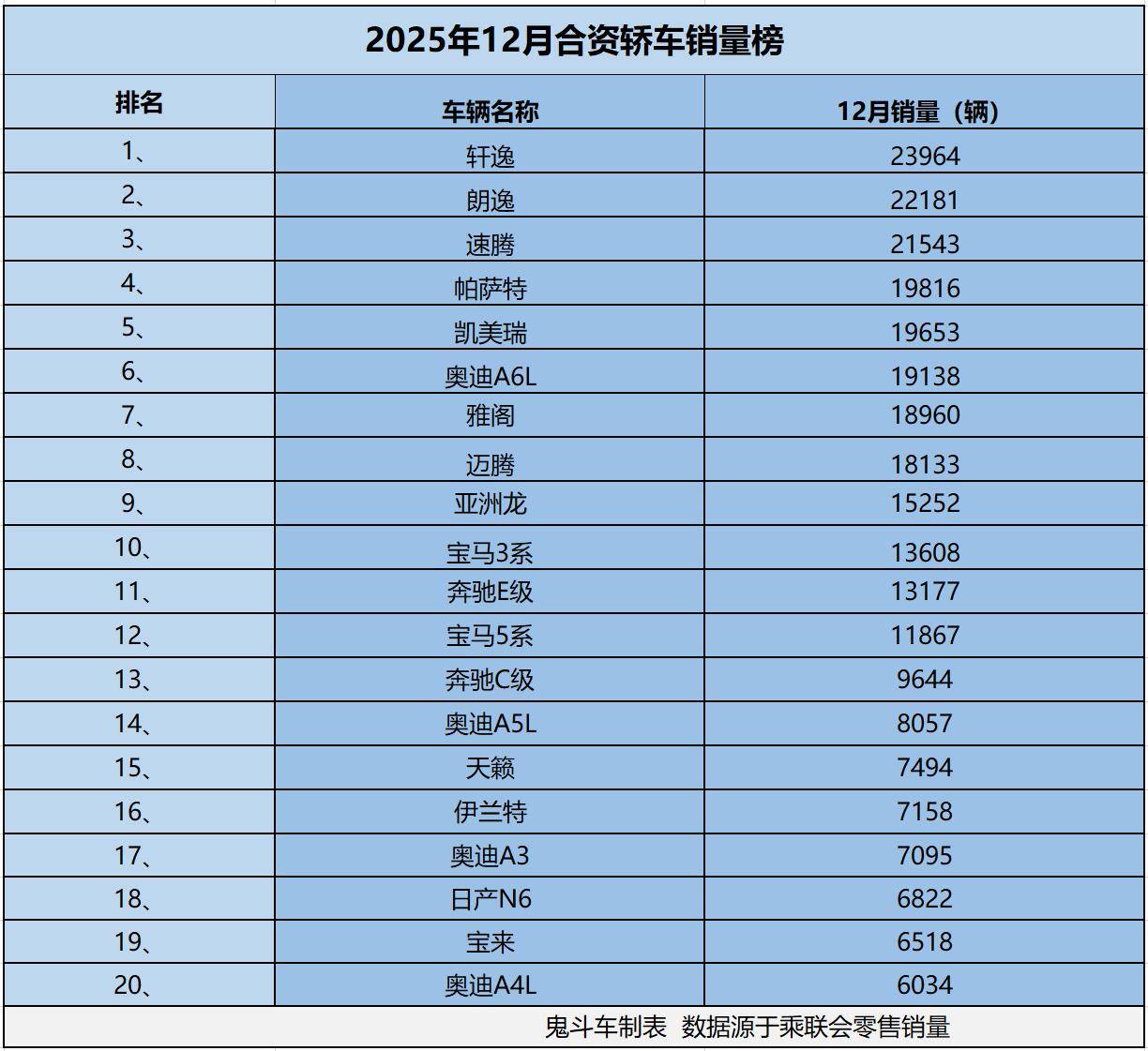 在流量至上的汽車市場環境中,部分品牌憑借話題熱度迅速躥紅,但市場表現終究要靠銷量說話。以合資品牌為例,盡管近年來在網絡聲量上略顯弱勢,實際銷售數據卻展現出強勁韌性,多款經典車型持續占據銷量榜單前列。乘聯會最新發布的零售數據顯示,2025年12月合資轎車市場共有12款車型銷量突破萬輛大關,其中德系與日系品牌包攬了前六席位。