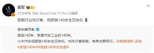 汽車行業(yè)的集體致敬成為本次紀(jì)念活動的溫暖注腳。小米汽車官方賬號率先發(fā)布賀詞,將奔馳的140年歷程與整個汽車工業(yè)的演進(jìn)畫上等號,并表示“有幸與君同行”的謙遜態(tài)度。小米集團創(chuàng)始人雷軍隨后轉(zhuǎn)發(fā)相關(guān)內(nèi)容,以“向行業(yè)先行者致敬”的簡短話語,傳遞出中國新能源車企對傳統(tǒng)豪華品牌的尊重。