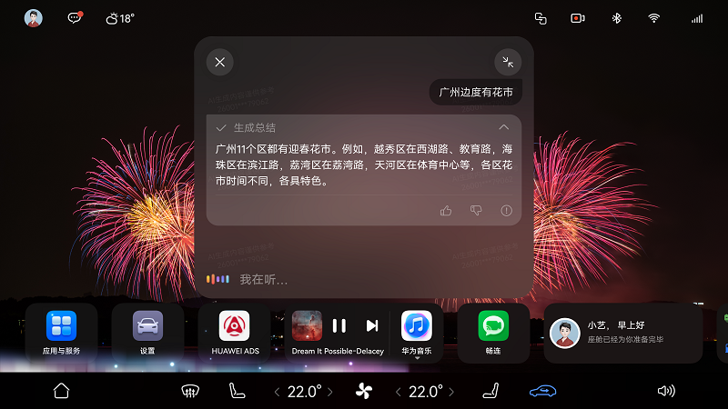 出發前,小藝能根據出行目的地,提前推送天氣情況,讓團圓之路少些等待、多些順暢;出游途中,小藝能結合春節場景主動推薦新春賀歲歌曲、熱門有聲讀物,讓車廂氛圍更歡樂,更能根據零散記憶、歌詞線索等模糊描述精準搜歌。