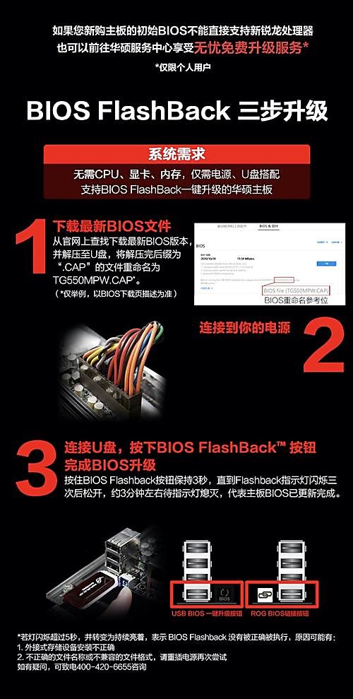 BIOS是主板上最基礎的固化程序,掌管硬件初始化、系統引導與底層設置。更新BIOS往往能帶來關鍵改進,比如修復硬件兼容性問題,修補安全漏洞,提升硬件穩定性,甚至還能解鎖隱藏功能。為便于用戶升級BIOS,華碩主板支持BIOS FlashBack一鍵升級功能,無需CPU、內存以及顯卡,僅需3步便可輕松完成升級。首先前往官網,下載主板型號對應的BIOS文件,解壓至U盤中并根據下載頁面說明重命名文件;其次連通主板電源,并將U盤插入主板后面板帶有【BIOS】標識的USB接口;最后按住BIOS FlashBack按鈕3秒至指示燈閃爍3次后松開,約3分鐘后指示燈熄滅即完成升級。
