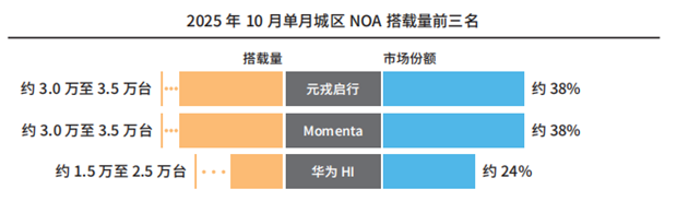 第三方智駕進(jìn)入新訂單主導(dǎo)時(shí)代,意味著新訂單的爭(zhēng)奪將成為企業(yè)競(jìng)爭(zhēng)的核心,而“技術(shù)+量產(chǎn)效率”正是企業(yè)爭(zhēng)奪新訂單的核心優(yōu)勢(shì)。《白皮書》數(shù)據(jù)顯示,2025年1-10月,元戎啟行城區(qū)NOA累計(jì)搭載量達(dá)12萬(wàn)至15萬(wàn)臺(tái),市場(chǎng)份額穩(wěn)居行業(yè)前三;10月單月市占率飆升至40%,成為單月市占率最高的第三方供應(yīng)商之一,其2.7倍的增長(zhǎng)倍數(shù),彰顯了強(qiáng)勁的增長(zhǎng)勢(shì)頭。