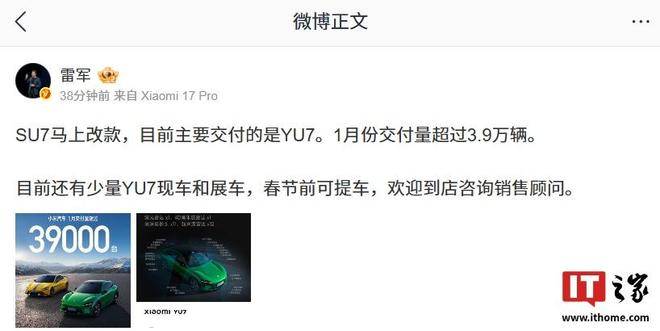 小米集團董事長雷軍在社交平臺發文證實,SU7即將推出改款車型,當前主要交付的是另一款車型YU7。這一表述與知情人士透露的信息形成呼應,顯示小米汽車正通過產品線優化推進品牌升級戰略。