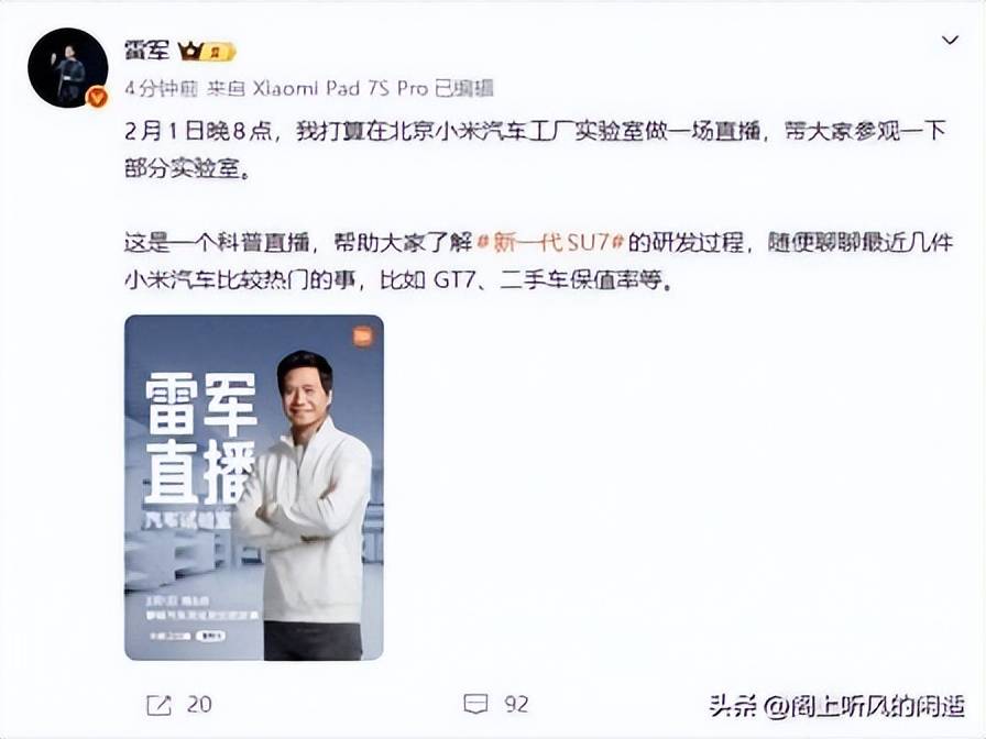 新能源汽車領(lǐng)域再掀熱潮,小米科技創(chuàng)始人雷軍宣布將于今晚8點(diǎn)開(kāi)啟特別直播,親自帶領(lǐng)觀眾走進(jìn)北京小米汽車工廠實(shí)驗(yàn)室,用一小時(shí)深度揭秘新一代SU7的研發(fā)全貌。這場(chǎng)直播不僅承載著消費(fèi)者對(duì)小米汽車的期待,更被視為智能汽車行業(yè)技術(shù)透明化的重要實(shí)踐,引發(fā)行業(yè)內(nèi)外高度關(guān)注。