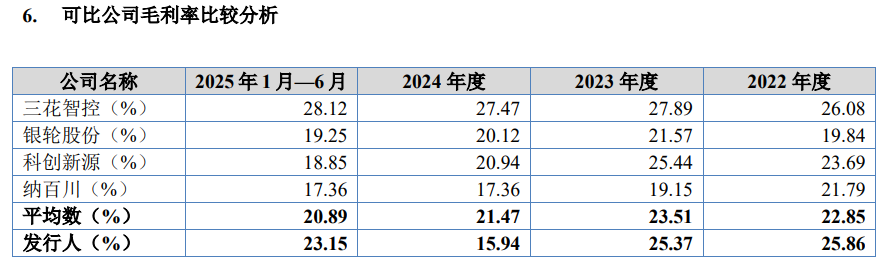 綜合毛利率方面,報告期內公司分別為25.86%、25.37%、15.94%及23.15%。2022年及2023年,公司綜合毛利率略高于行業平均水平,但2024年出現明顯下滑,主要受電池液冷板毛利率下降及產品結構變化影響。2025年上半年,綜合毛利率有所回升,反映出公司業務調整的初步成效。