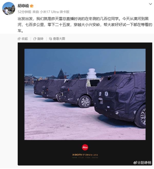 近日,順為資本投資合伙人胡崢楠在社交平臺發布了一組偽裝測試車的照片,引發了汽車行業的廣泛關注。照片中的四臺SUV測試車身披重度偽裝,正在極寒環境下進行測試。胡崢楠在配文中透露,測試車隊從漠河一路行駛至黑河,全程七百多公里,在零下二十五度的低溫中穿越大小興安嶺,為的是“好好試一下‘都在等著的車’”。