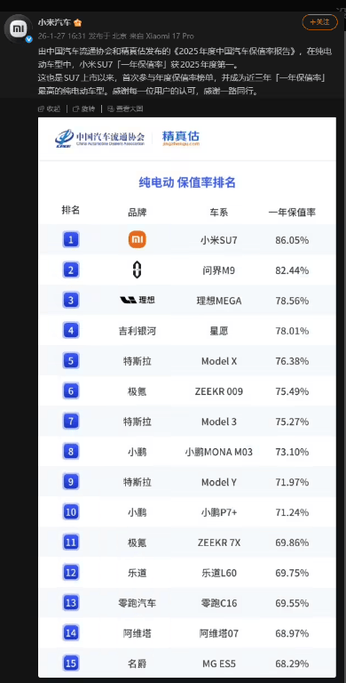 他引用了中國汽車流通協會與精真估聯合發布的《2025年度中國汽車保值報告》,明確指出:“小米SU7在2025年度純電車型一年保值率中以86.05%的成績位居榜首,是當前保值率最高的電動汽車。”雷軍進一步解釋,這一數據直接反駁了二手車商的片面言論,并呼吁公眾在遇到類似不實信息時積極舉報。