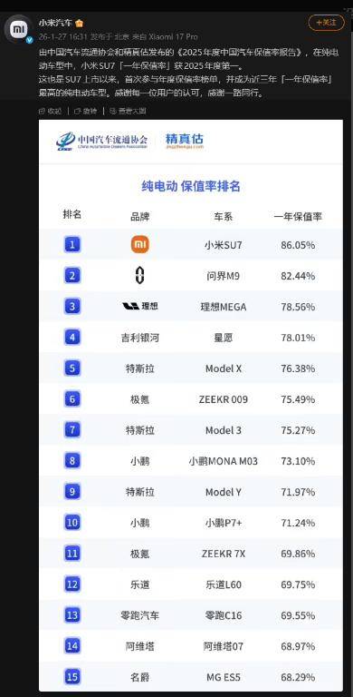 針對近期網(wǎng)絡(luò)熱議的SU7二手車市場爭議,雷軍在直播中首次公開回應(yīng)。他指出,部分二手車商通過夸張表演炒作"小米二手車崩盤"話題,試圖制造輿論熱點。為澄清事實,雷軍現(xiàn)場展示了中國汽車流通協(xié)會與精真估聯(lián)合發(fā)布的《2025年度中國汽車保值報告》。數(shù)據(jù)顯示,小米SU7以86.05%的年度純電車型一年保值率登頂榜首,顯著領(lǐng)先于保時捷Taycan(80.66%)和特斯拉Model S(81.72%)等豪華品牌車型。