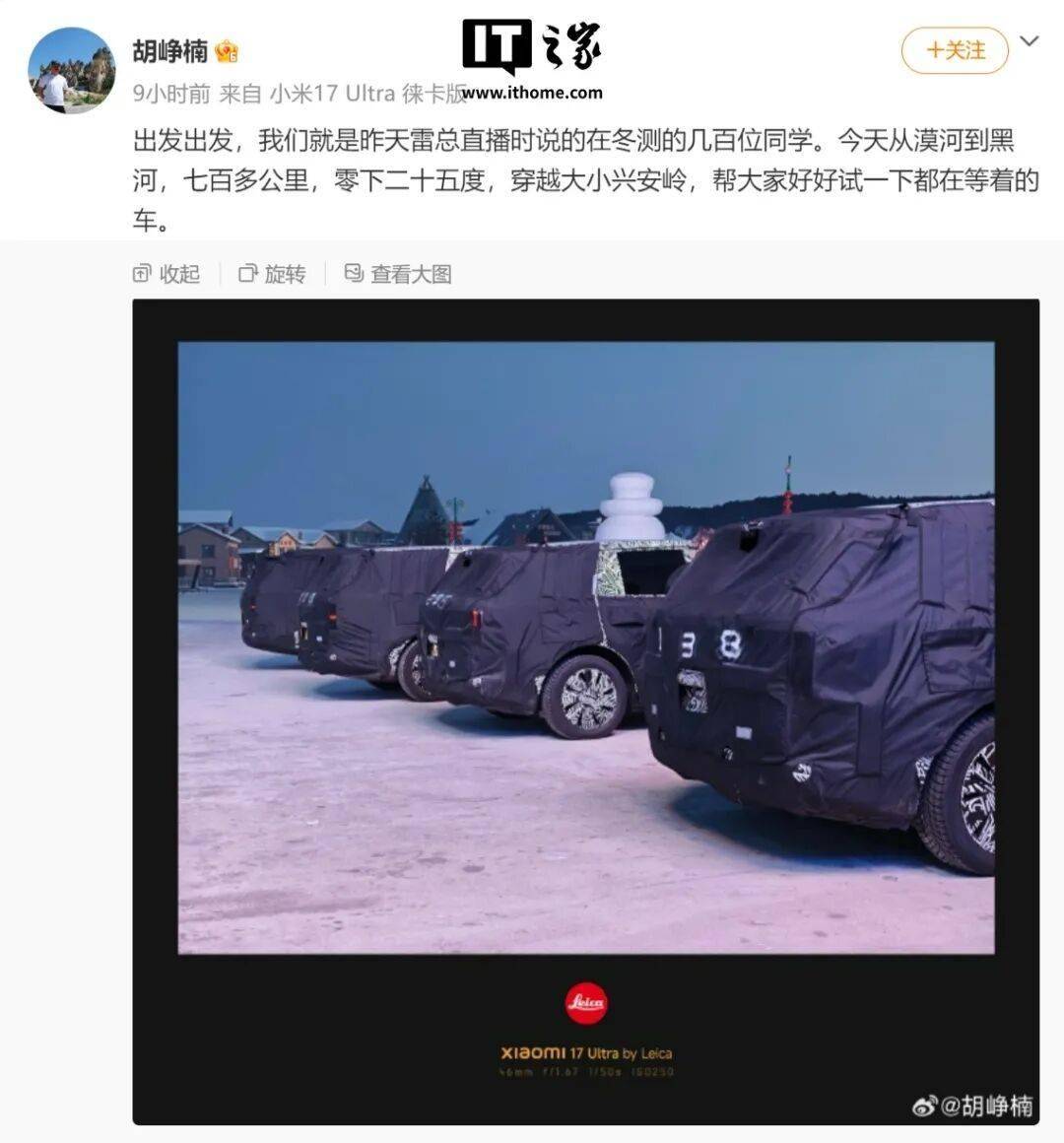 胡崢楠的博文提到,他正參與小米新車的冬測工作,從漠河到黑河的700公里行程中,測試車隊需在零下25度的極端環境下穿越大小興安嶺。配圖中,四臺身披偽裝的SUV測試車整齊排列,車身輪廓與外界傳聞的“YU9”高度吻合。結合其小米汽車高級顧問的身份及文中“雷總直播時說的冬測”等細節,外界普遍認為這便是小米即將推出的首款大型增程SUV。