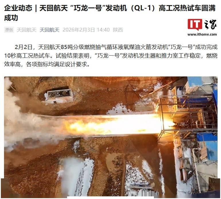 天回航天“巧龍一號”再傳捷報:高工況熱試車成功,指標全達標