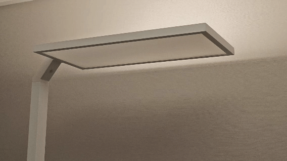 上光源通過漫反射技術將光線投射至天花板,漫反射角度可達164°,在DIALux模擬測試*1中,天花板平均照度達475lx,為房間補充柔和的環境光,讓工作區域與周邊空間的亮度差縮小至人眼舒適范圍。這一設計符合推薦性國標GB/T45515-2025對全屋照明用落地燈的要求。既滿足書桌讀寫的核心需求,又能兼顧全屋均勻照明,提升整體空間光環境舒適度。
