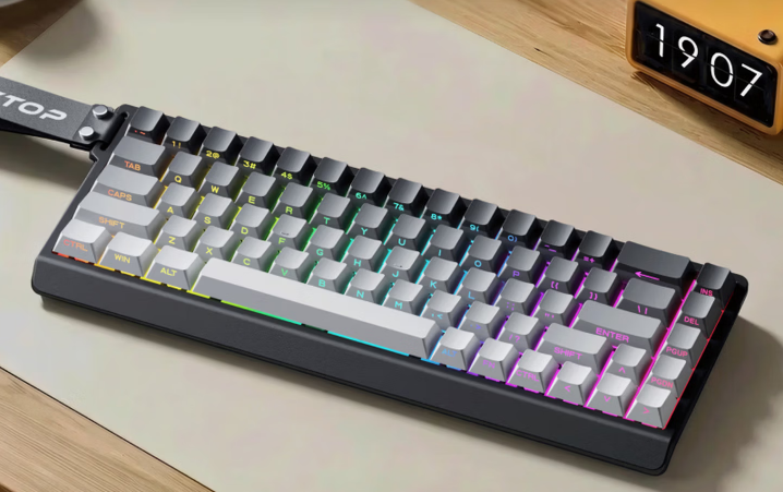 前行者F61采用極致的60%配列設計,移除了F功能鍵區、數字小鍵盤和所有導航鍵,尺寸僅相當于一本小型筆記本。這是評測中最緊湊的鍵盤,適合追求極致桌面簡潔或需要頻繁攜帶外出的用戶。