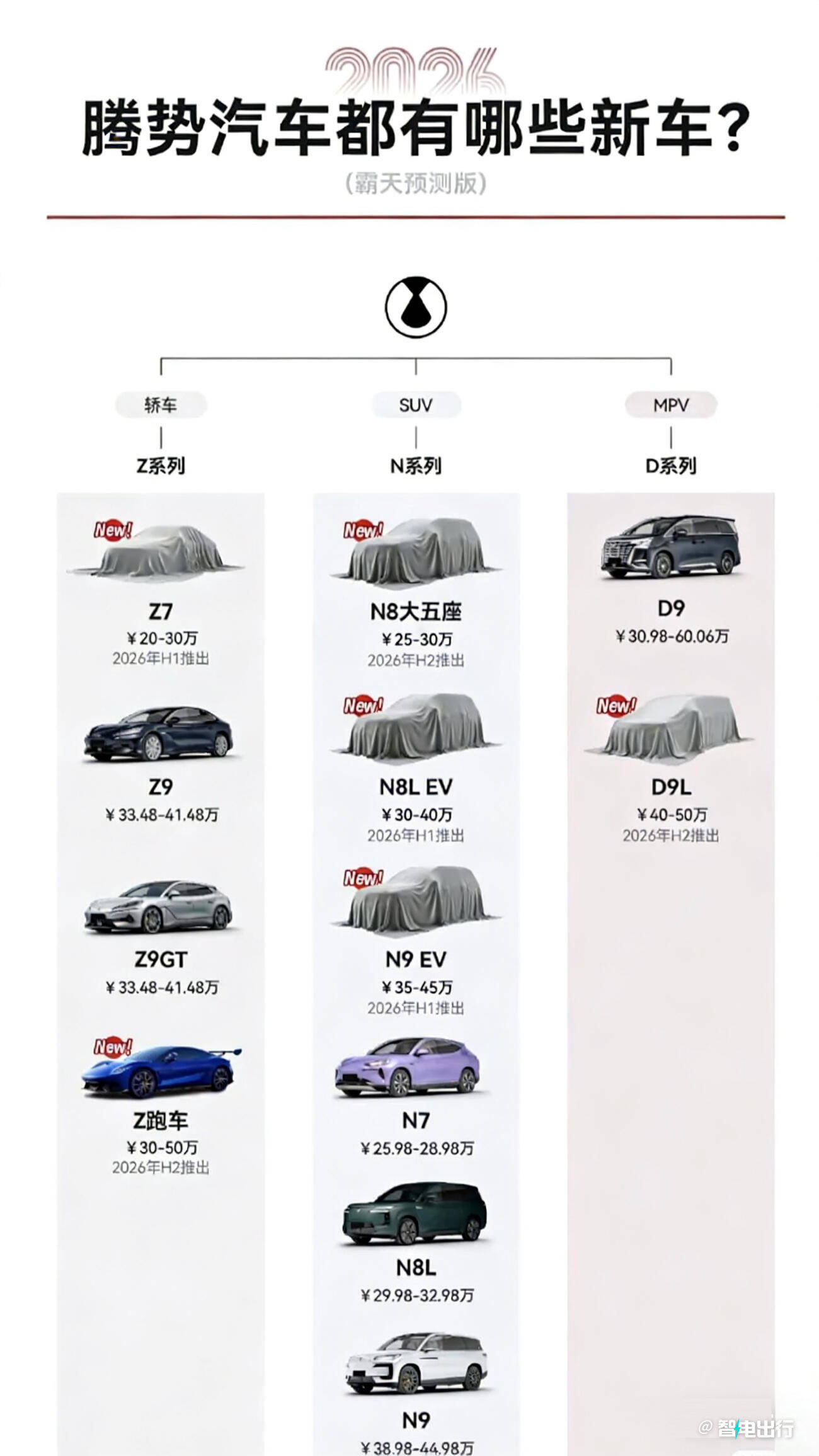 根據網絡流傳的車型規劃,騰勢將覆蓋轎車、SUV和MPV三大細分市場。轎車系列包含Z7、Z9、Z9GT及Z四款車型;SUV陣營則有N8、N8L純電版、N9純電版、N7、N8L和N9共六款選擇;MPV領域將推出D9和D9L兩款車型。該名單與李慧提及的12款新車數量完全吻合,但具體配置仍需以官方發布為準。