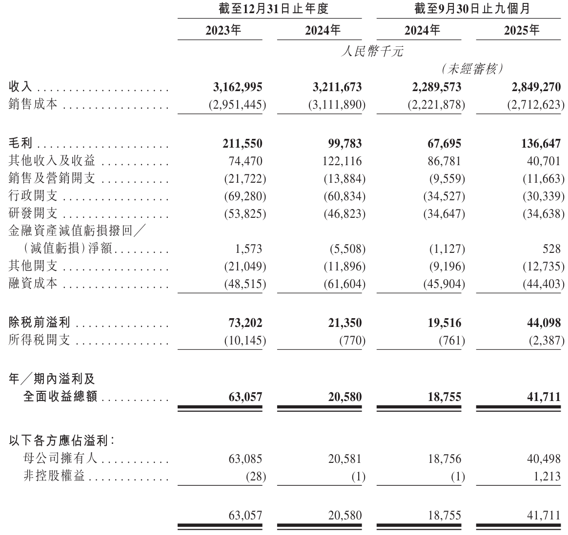 根據(jù)招股書披露的財(cái)務(wù)數(shù)據(jù),銅博科技在2023年實(shí)現(xiàn)營業(yè)收入31.63億元,毛利2.12億元,期內(nèi)利潤6306萬元;2024年?duì)I收微增至32.12億元,但毛利下降至9978萬元,期內(nèi)利潤縮減至2058萬元。進(jìn)入2025年后,公司經(jīng)營狀況有所改善,前9個(gè)月營收達(dá)28.49億元,毛利1.37億元,期內(nèi)利潤回升至4171萬元。