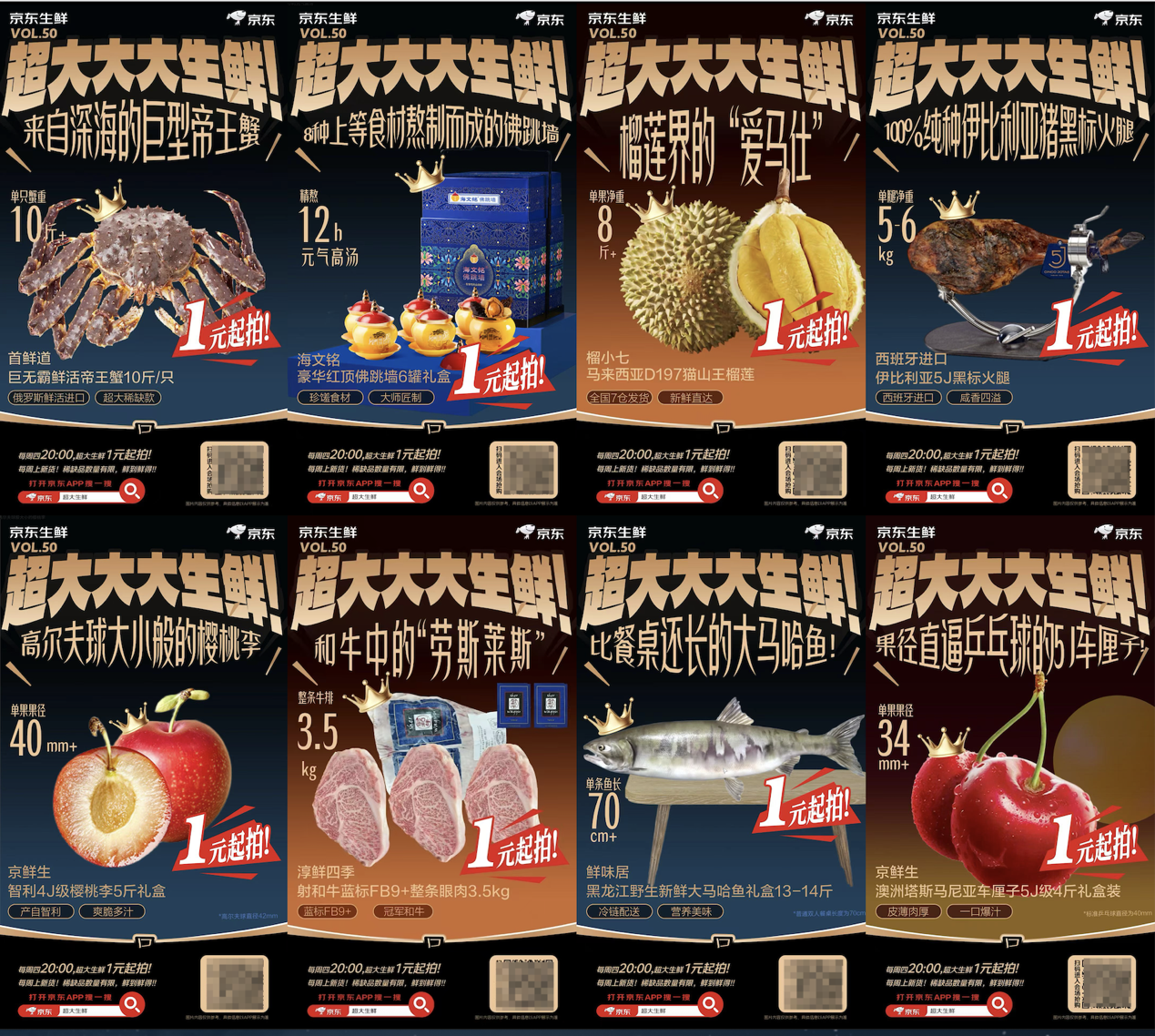此外,還有超大生鮮1元起拍活動,匯聚了全球珍稀好物。不論是單只10斤重的俄羅斯巨無霸帝王蟹、海文銘豪華紅頂佛跳墻6罐禮盒、單果8斤重的馬來西亞D197貓山王榴蓮,還是西班牙進口伊比利亞5J黑標火腿、單枚超過500g克的澳洲鸝鶴蛋、澳洲5J級車厘子等,統統1元起拍,為新春增添更多驚喜與樂趣。