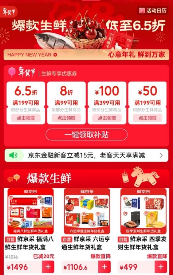 為滿足消費者對年貨贈禮的需求,2月4日,京東生鮮推出送禮驚喜日活動,圍繞“心意年禮、鮮到萬家”的主題,帶來多重驚喜優惠。活動期間,消費者可享“滿99打8折,滿199打6.5折”福利,爆款生鮮低至6.5折;2月5日晚八點至2月6日,優惠力度持續加碼,滿199直接打5.5折,爆款生鮮同步低至5.5折。不僅如此,還有千元生鮮年貨大禮包抽獎活動,以及1元拍巨型帝王蟹、5J車厘子、伊比利亞5J黑標火腿等超大生鮮,一站式滿足消費者春節送禮場景,讓高品質生鮮直達千家萬戶。
