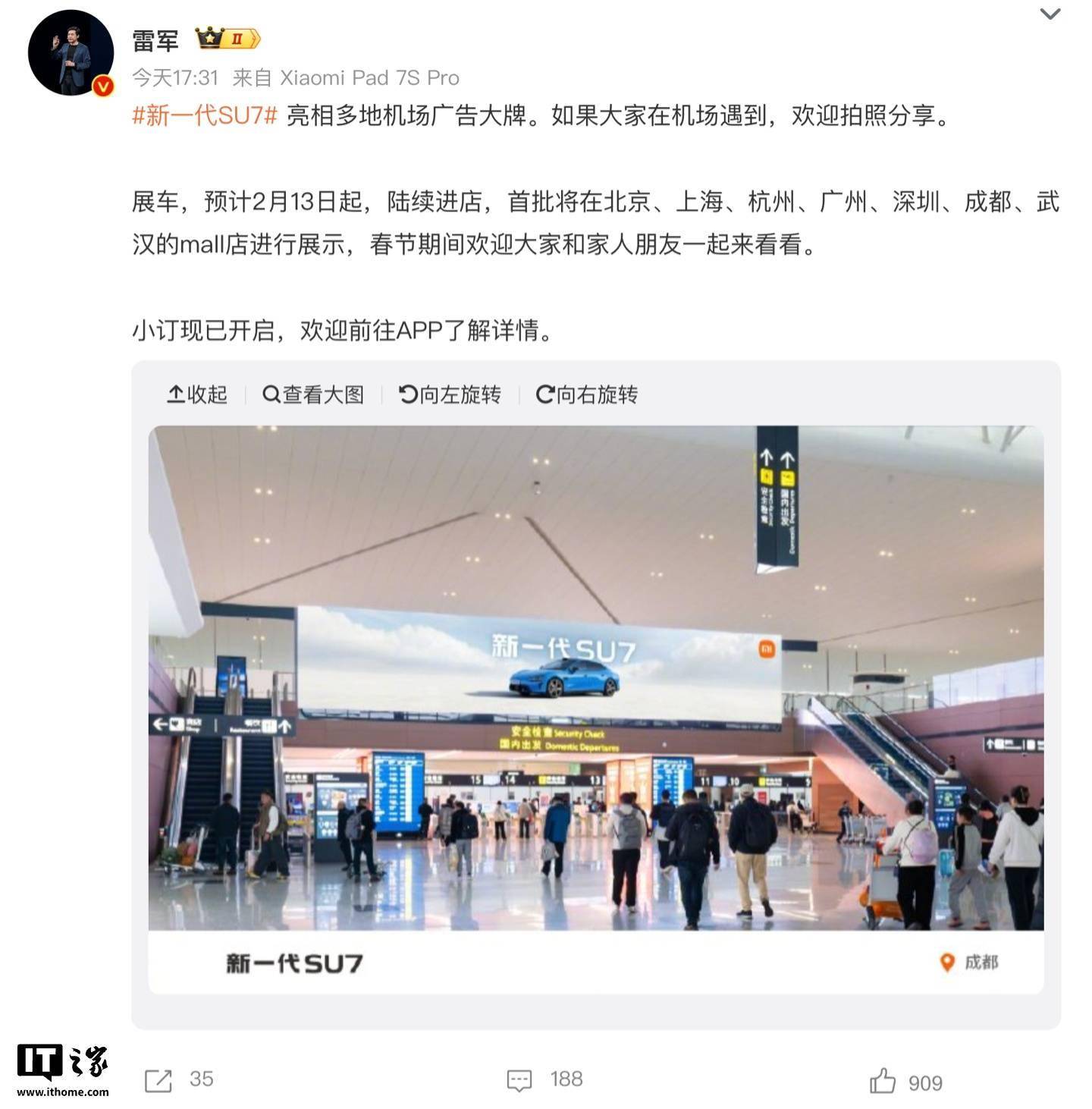 近日,小米汽車創始人雷軍通過社交平臺發布消息,宣布新一代小米SU7正式開啟機場廣告投放。根據雷軍微博發布的照片顯示,成都雙流國際機場已出現該車型巨幅廣告,并邀請公眾偶遇時拍照分享。此次廣告投放標志著小米汽車正式進入線下宣傳密集期。