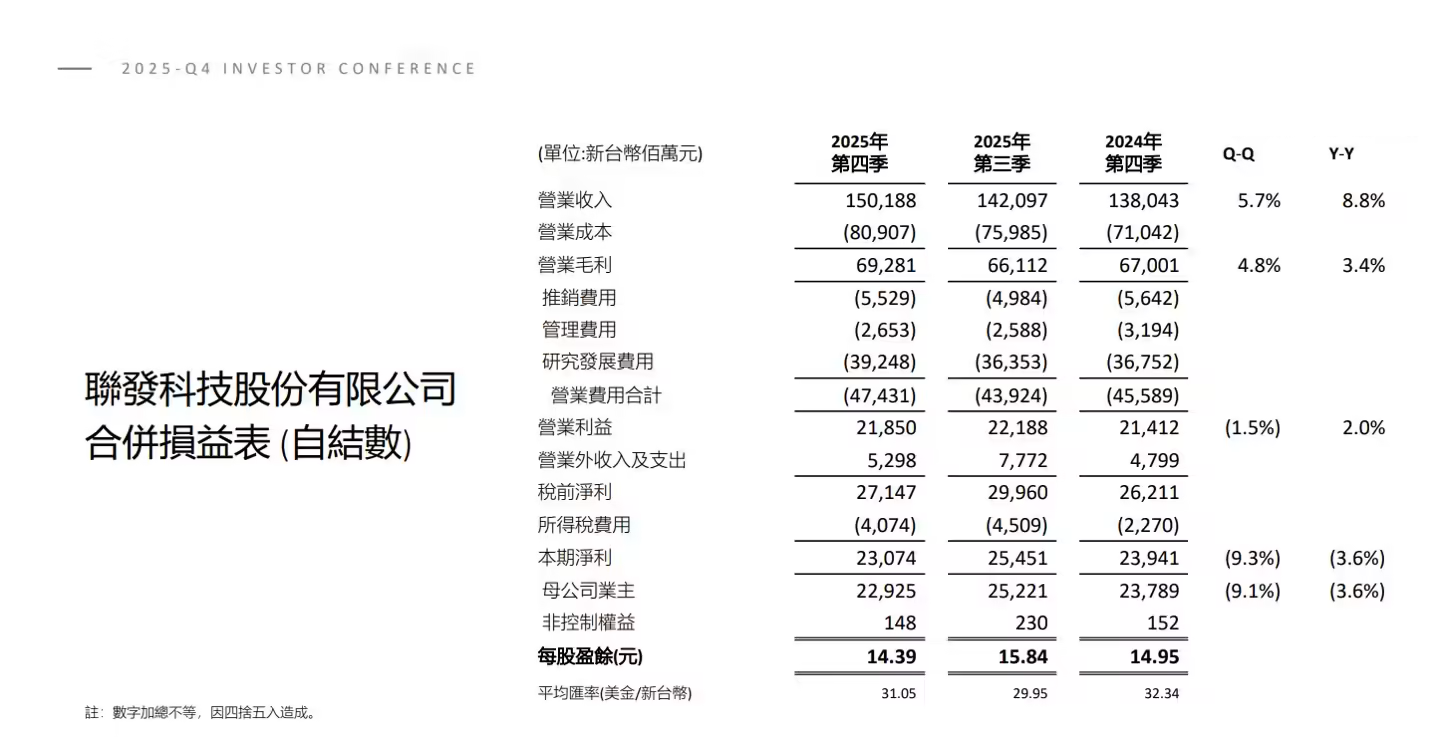 聯發科近日公布了2025年第四季度及全年財務業績。數據顯示,公司第四季度表現穩健,營業收入達到1501.88億元新臺幣,按當前匯率折算約為331.77億元人民幣,較去年同期增長8.8%,環比增幅為5.7%。這一成績反映出聯發科在市場中的持續競爭力。