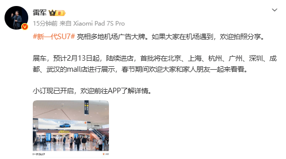 小米汽車近日宣布,其新一代旗艦車型SU7正式啟動全國多地展示計(jì)劃。即日起,這款備受矚目的新能源轎車將陸續(xù)登陸北京、上海、廣州、深圳、杭州、成都、武漢等七大城市的核心商圈商場門店,為消費(fèi)者提供近距離體驗(yàn)機(jī)會。此前,該車型已通過機(jī)場廣告大牌完成首次亮相,雷軍通過社交平臺邀請公眾參與互動,鼓勵用戶拍攝廣告畫面并分享體驗(yàn)。