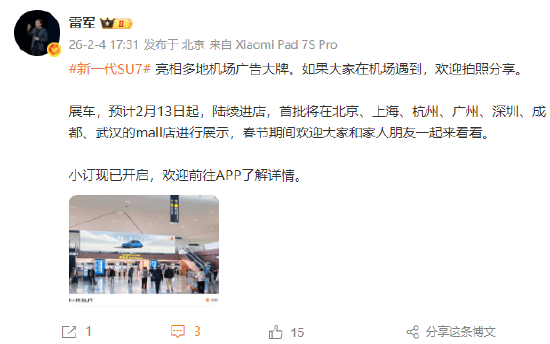 小米汽車又有新動作!雷軍近日在社交平臺透露,新一代SU7已正式登陸多地機場廣告位,吸引往來旅客的目光。若在機場偶遇這款新車廣告,歡迎拍照分享互動。
