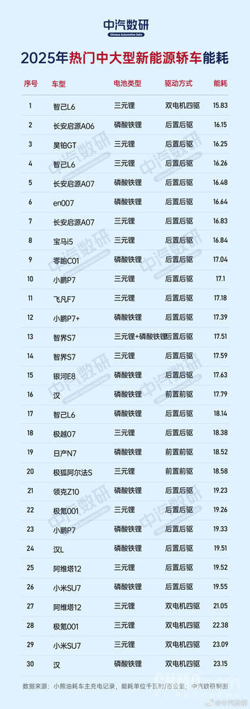 2025熱門中大型新能源汽車能耗排名出爐 智己L6與別克E5成節能標桿