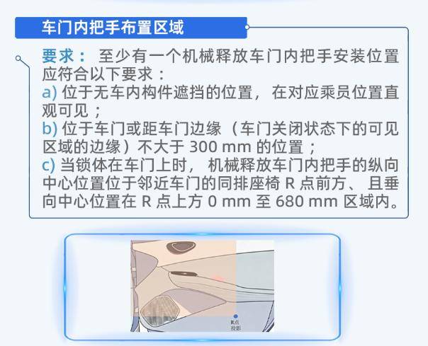 車內把手設計細節同樣被嚴格規范。標準要求每個車門(不含背門)至少配備一個獨立操作的機械釋放內把手,且安裝位置需滿足三項條件:無車內構件遮擋、距車門邊緣不超過300毫米、縱向中心位于同排座椅R點前方且垂向中心在R點上方0至680毫米區域內。為提升識別度,內把手需配備永久性標志,圖形尺寸不小于10mm×7mm,顏色與背景形成鮮明對比,夜間需清晰可見;操作說明需以中文或圖示形式呈現,高度不低于6毫米,放置于標志或把手附近。