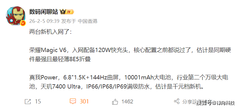 折疊屏賽道再添新軍,榮耀Magic V6通過工信部入網認證。據供應鏈消息,這款橫向大折疊手機將搭載驍龍8 Elite Gen5處理器,配備7000mAh超大容量電池,機身厚度較前代進一步縮減。行業分析師指出,榮耀在鉸鏈技術、屏幕耐用性等核心領域已建立技術壁壘,新品有望在MWC2026期間成為關注焦點。REDMI Turbo 5系列首銷數據同步披露,雖未公布具體銷量,但官方確認同比實現顯著增長,詳細市場表現待后續數據補充。
