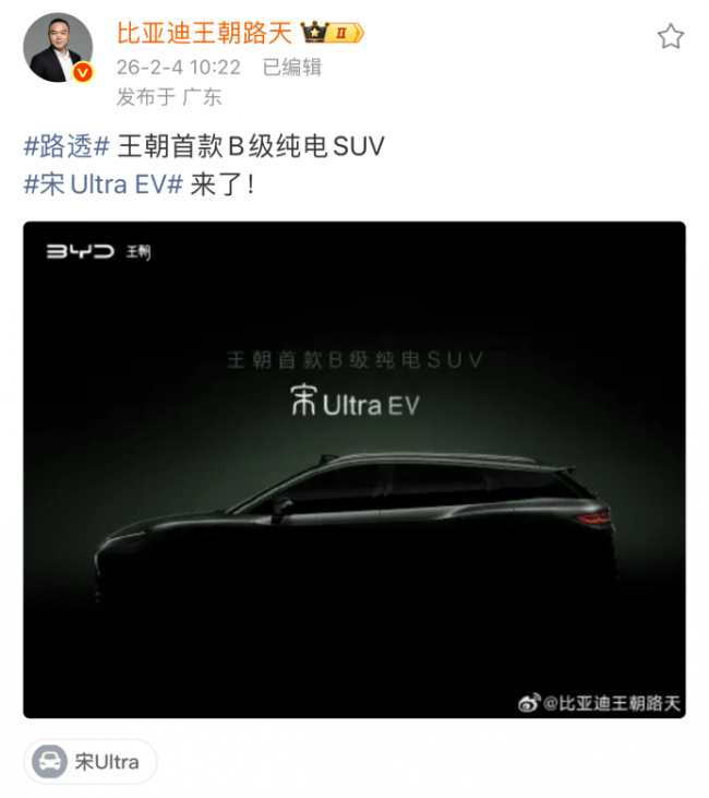 比亞迪王朝網銷售總經理路天近日通過社交平臺發布預熱海報,正式官宣王朝系列全新B級純電SUV——宋Ultra EV。這款定位高端的新車憑借越級空間與智能配置引發市場關注,預計將于一季度正式上市。