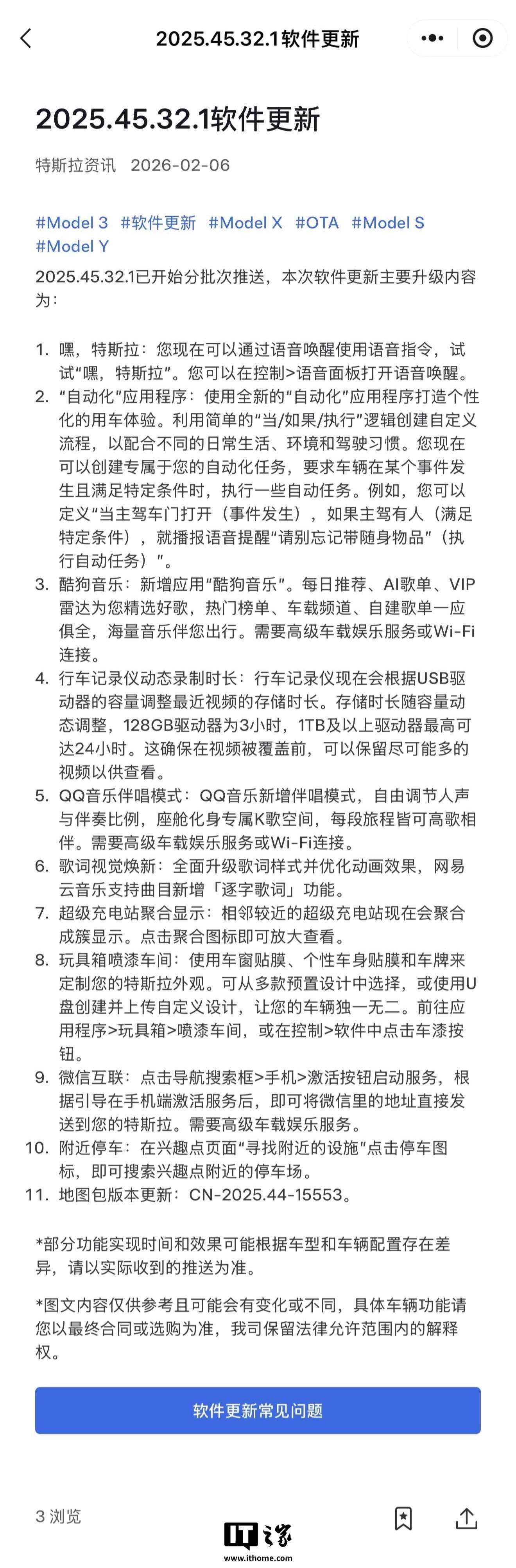 需要特別注意的是,酷狗音樂、QQ音樂伴唱模式、微信互聯等功能需訂閱高級車載娛樂服務或連接Wi-Fi使用。此次更新同步將地圖包版本升級至CN-2025.44-15553,進一步提升導航精準度與路況更新頻率。從語音操控到場景編程,從娛樂擴展到充電導航,特斯拉正通過持續的軟件迭代重構智能出行生態。