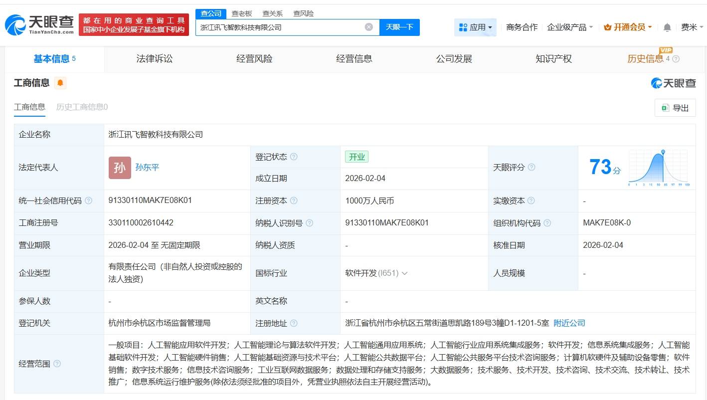 科大訊飛(002230)近日完成了一項(xiàng)重要布局——全資成立浙江訊飛智教科技有限公司。新公司法定代表人為孫東平,注冊資本達(dá)1000萬元人民幣,業(yè)務(wù)范圍聚焦人工智能領(lǐng)域,涵蓋應(yīng)用軟件開發(fā)、理論與算法研究以及通用應(yīng)用系統(tǒng)開發(fā)等多個(gè)方向。
