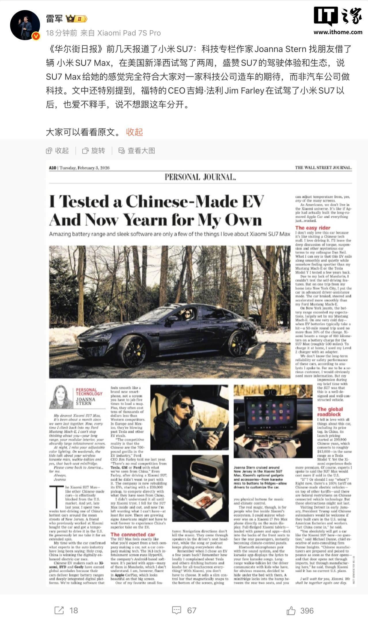 小米SU7近期在國際汽車圈引發(fā)廣泛關(guān)注。據(jù)《華爾街日報(bào)》報(bào)道,科技專欄作家喬安娜·斯特恩通過朋友借到一輛小米SU7 Max,在美國新澤西進(jìn)行了為期兩周的深度試駕。她在體驗(yàn)后盛贊這款車型的駕駛感受與智能生態(tài)系統(tǒng),認(rèn)為其完美契合科技公司跨界造車的創(chuàng)新定位,與傳統(tǒng)汽車廠商的科技應(yīng)用形成鮮明對比。