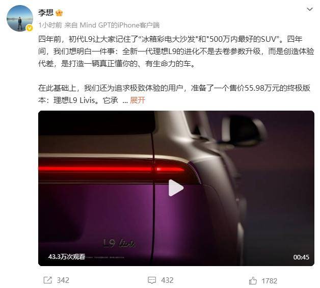 據(jù)理想汽車CEO李想透露,全新L9的研發(fā)重心從參數(shù)堆砌轉(zhuǎn)向體驗(yàn)代差。他特別提到,四年前初代車型以“500萬內(nèi)最好SUV”的標(biāo)簽打開市場,而新一代產(chǎn)品將通過智能化與機(jī)械性能的深度融合,打造“有生命力的座駕”。為滿足高端用戶需求,理想同步推出售價(jià)55.98萬元的L9 Livis終極版本,該車型承載了品牌對未來出行的核心思考。