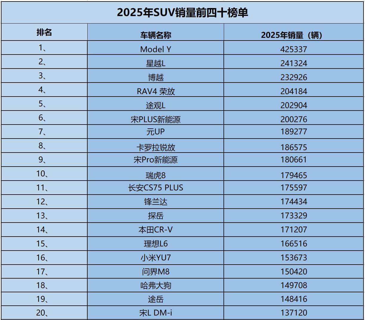 瑞虎8和長安CS75 PLUS作為國產SUV的代表,分別以179,465輛和175,597輛的銷量躋身前十。鋒蘭達和探岳則以174,434輛和173,329輛的銷量位列第十二、第十三位,展現了合資品牌在SUV市場的持續競爭力。本田CR-V、理想L6、小米YU7等車型也進入前二十榜單,年銷量均超過13萬輛。