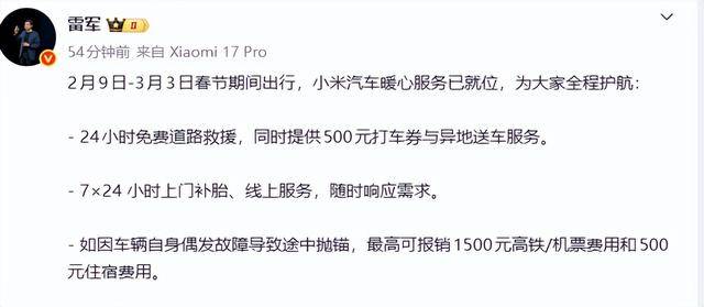 春節(jié)假期臨近,小米汽車宣布推出一系列出行保障服務(wù),為車主返鄉(xiāng)和出游提供便利。2月9日至3月3日期間,小米汽車將上線三項暖心舉措,涵蓋道路救援、上門服務(wù)及費用補(bǔ)償?shù)榷鄠€場景,切實解決用戶長途出行中的后顧之憂。