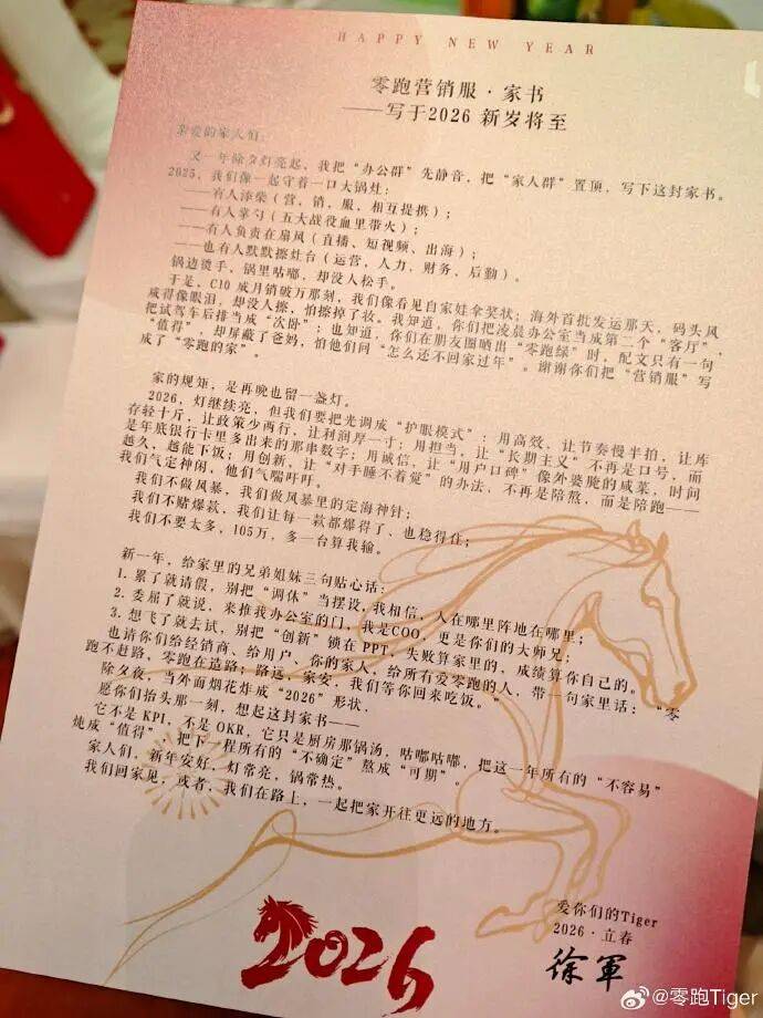 零跑汽車首席運營官徐軍近日通過微博發布《寫給零跑營銷服的家書》,透露公司2026年經營戰略將聚焦高效運營與庫存優化,同時提出"105萬輛"的年度銷量目標,較2025年底制定的100萬輛計劃上調5%。這一數字較2025年60萬輛的實際銷量增長76%,相當于在現有基礎上實現跨越式突破。