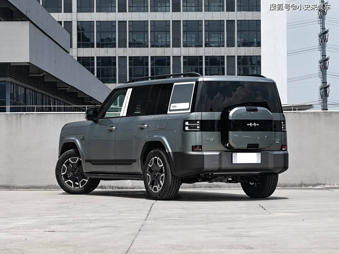 車身設計方面,鈦7采用懸浮式車頂與同色輪眉的組合,搭配4999mm×1995mm×1865mm的車身尺寸和2920mm軸距,在保證城市駕駛靈活性的同時,通過210mm離地間隙和600mm涉水深度強化越野能力。傳統外拉式車門把手與固定式側踏板兼顧實用性,C柱至D柱的黑化處理和半封閉式側窗則增添了運動感。車尾部分,上窄下寬的方正造型搭配雙層尾燈組,通過黑色飾條連接形成視覺延伸效果。外掛式“小書包”儲物箱容量達32.5L,可放置工具或露營裝備,側開式尾門支持無級調節高度,地臺隔板提供兩種儲物模式,滿足日常與戶外場景需求。