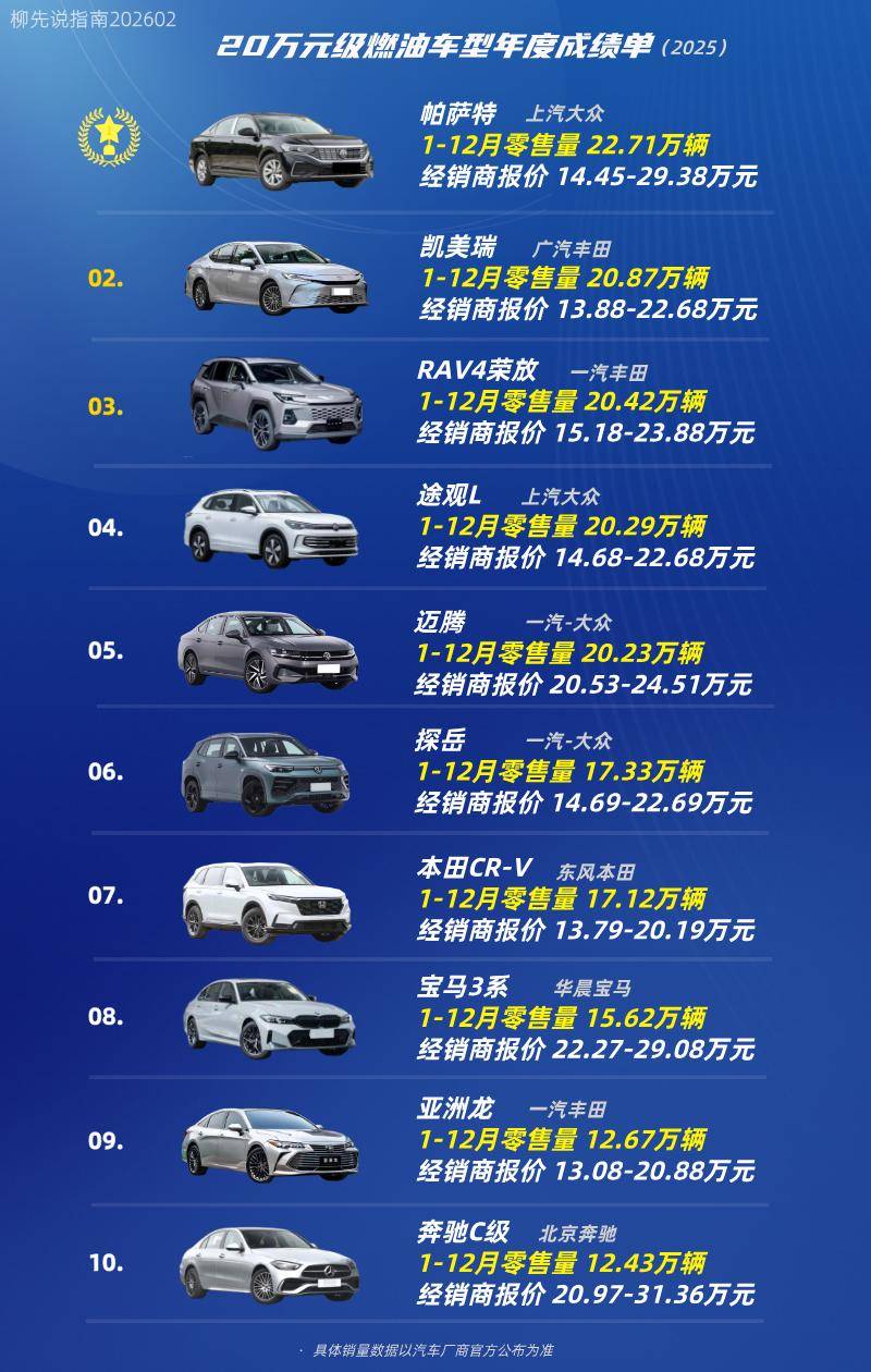 在燃油車市場的細分領域中,20萬元級市場極具代表性,是各大車企競爭的核心焦點。即便整體燃油車市場呈下滑態勢,20萬元級燃油車市場依然擁有穩定的基本盤。這一價格區間的車型,既能滿足消費者對品質、空間和配置的需求,又不會像高端豪華車型那樣價格過高,精準覆蓋了中端家用、商務通勤等主流用車場景,無論是家庭用戶還是商務用戶,都能從中找到心儀的車型。
