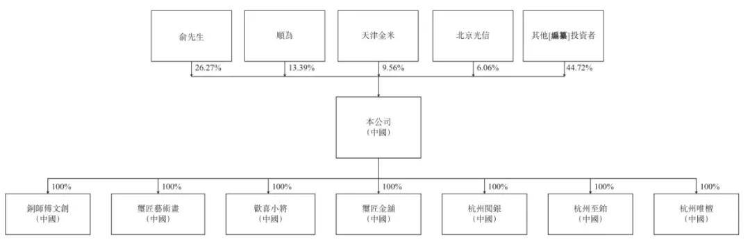 銅師傅成立于2013年,以銅為核心材質,通過垂直整合研究、設計、生產與銷售環節,打造兼具文化內涵與藝術價值的工藝品。近年來,公司逐步將材質范圍擴展至金、銀及塑膠領域,以吸引更廣泛消費群體。創始人俞光目前持有公司26.27%的表決權,擔任董事長兼CEO職務。其管理團隊包括執行董事羅仁祥、何贇、汪小霞及陳銳廣,非執行董事肖峰,以及獨立董事涂必勝、黃文禮和方俊輝。