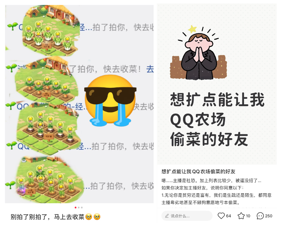 更有農場玩家,玩的可不止是偷菜,更是花式整活!偷菜互助群里,大家實時共享 “偷菜情報”——誰的菜熟了、誰家的狗不咬人;玩家們還自發開啟二創狂歡,農場截圖做成搞怪表情包,“偷菜被狗咬”“一鍵收菜爽到飛起” 的梗圖在群里傳瘋;撿手機文學、農場小劇場接連上線,“你的竹馬是個愛玩QQ農場的笨蛋” 這類趣味內容在社交平臺上收獲了很高的互動。