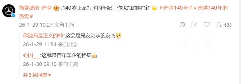 在這場營銷變革中,奔馳展現出高超的公關智慧。面對長城汽車的祝福,奔馳回應“共筑汽車行業的長城”;對智己的“愛你老己”調侃報以幽默;與保時捷則強調“始于共同的起點,駛向各自的傳奇”。即便面對老對手寶馬,奔馳也以“140歲正是打拼的年紀,你也加油啊‘寶’”的文案化解鋒芒。這種既保持競爭張力又傳遞善意的互動,被營銷界視為“競合營銷”的典范。