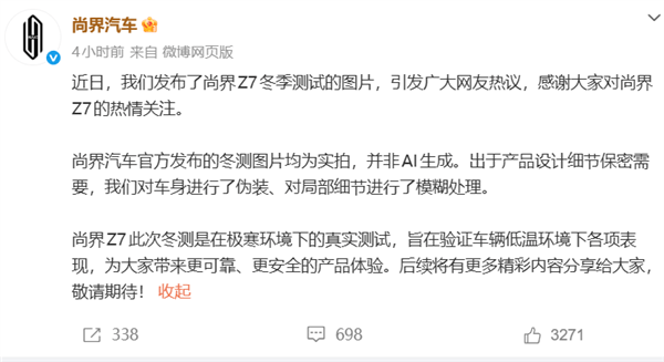 面對(duì)迅速發(fā)酵的輿論,尚界汽車于2月9日緊急發(fā)布聲明。官方強(qiáng)調(diào)三方面內(nèi)容:其一,所有冬測(cè)圖片均為極寒環(huán)境下的實(shí)拍素材,不存在AI生成或修圖偽造;其二,輪轂與輪胎的視覺差異源于測(cè)試階段的保密處理,對(duì)局部細(xì)節(jié)進(jìn)行模糊處理導(dǎo)致視覺偏差;其三,冬季測(cè)試旨在驗(yàn)證電池續(xù)航、動(dòng)力輸出等核心性能,為量產(chǎn)上市做準(zhǔn)備,沒有偽造測(cè)試的必要。