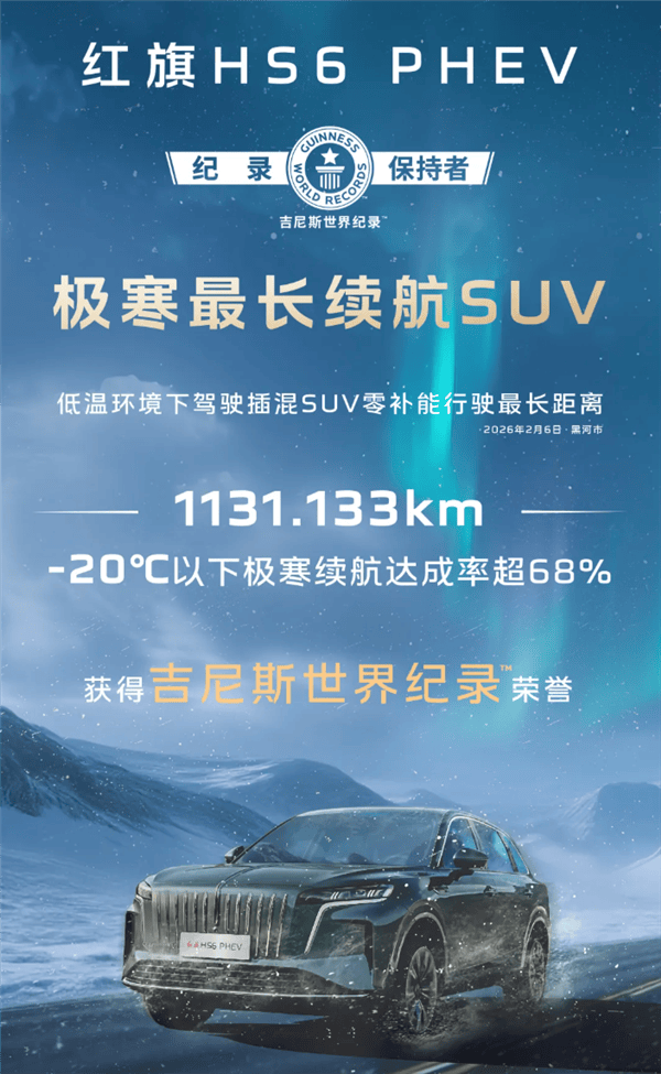 極寒挑戰顯實力!紅旗HS6 PHEV零補能續航破1131公里創紀錄
