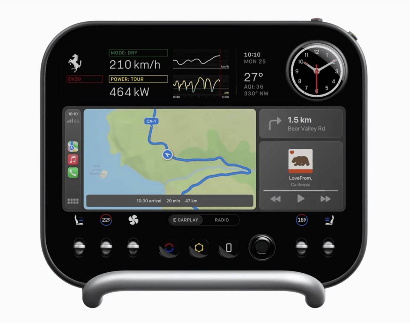人機交互系統以“觸感優先”為原則,在數字化浪潮中保留實體控制模塊。方向盤借鑒20世紀50-60年代木質Nardi方向盤的極簡三幅結構,通過模塊化設計減重400克,兩側控制區延續F1賽車布局。中控臺創新引入彩色E-Ink墨水屏鑰匙,插入瞬間屏幕由暖黃轉為深黑,同步激活儀表盤與中控屏的聯動光效。三屏系統分工明確:儀表盤采用雙層重疊OLED面板(三星聯合開發)實現高對比度顯示;中控屏配備球形轉軸可雙向旋轉,集成掌托與多功能球形儀表,支持時鐘、計時器、彈射起步指南等功能切換;頂部懸浮屏則專注顯示時速、功率等核心參數。