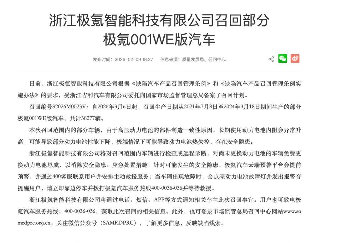 召回行動源于極氪云端監(jiān)測系統(tǒng)對動力電池的提前風(fēng)險預(yù)警。經(jīng)檢測發(fā)現(xiàn),部分車輛因電池內(nèi)部部件制造工藝存在一致性偏差,長期使用后可能出現(xiàn)內(nèi)阻異常升高、性能衰減等問題。為消除安全隱患,企業(yè)將為召回車輛免費更換全新電池,并完整保留原有三電系統(tǒng)終身質(zhì)保權(quán)益。